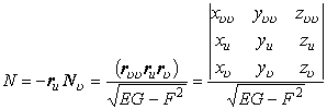 式中偏导数等在点取值,EFG为第一基本量,N为曲面在点M的法线单位矢量。