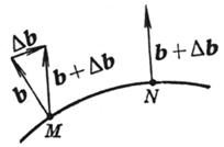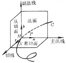[活动标架的三个单位矢量]  t为单位切线矢量,方向与曲线的正向一致;n为单位主法线矢量,它指向曲线的凹方;b为单位副法线矢量,b=tn.t,n,b构成右手系(图7.18.这三个矢量称为曲线在点M的活动标架(或叫动标三面形、伴随三面形,也叫活动标形).