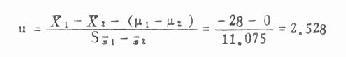 一、两均数的比较例7.6 某工业区卫生防疫站为掌握学龄儿童免疫球蛋白水平,对一批无结核及肾炎病史,一月内无急性感染,又未进行预防接种的学生作了血清IgM(mg/dl)测定,其中12岁男孩73人的X±S为125±54,12岁女孩68人的为153±75,试比较12岁男、女孩的IgM水平有无显着差别。 这里令男生为第1组,女生为第2组。 (1)检验假设H0:μ1=μ2;H1:μ1≠μ2。 (2)定α=0.05则对应于P为0.05时的u0.05值为1.96。 (3)求两均数的相差数X1-X2、两均数相差的标准误Sχ1-χ2及u值。此外,计算Sχ1-χ2的公式为