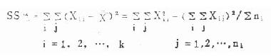 式中SS总即总离均差平方和,Xij表示第i组的第j个观察值,X为全部观察值的平均数,k是组数。