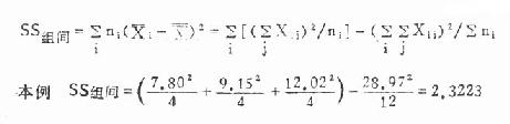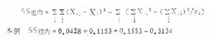 由本例计算结果可以看出,SS组间+SS组内=SS,如2.3223+0.3134=2.6357。因此,算出SS以后再计算SS组间、SS组内两者中之一个,其余一个便可通过减法求得。