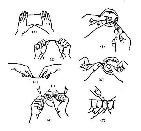 (4)嘱病人张开上下齿擦洗左侧上下内侧(咬合面)。同法擦洗右侧上下内侧,上腭及舌面(勿触及咽部,以免引起恶心),并弧形擦洗两侧颊部粘膜,每擦洗一个部位,更换1个湿棉球。舌苔厚或口腔分泌物过多时,用压舌板包裹纱布擦净分泌物。 (5)协助漱口,必要时可用吸水管吸漱口液或用注洗器沿口角将温开水缓缓注入,嘱属人漱口,然后再由下侧口角吸出,撤去弯盘,用纱布擦净口周。 (6)再次观察口腔是否清洗干净,口腔粘膜如有溃疡,可用珠黄散或冰硼散、锡类散、西瓜霜等撒布溃疡处,口唇干裂可涂石蜡油,取下毛巾,整理用物,清洁消毒后备用。 对口腔秽臭的病人,除按上述方法进行口腔护理处,每日可用漱口水、中药藿香煎成的汤、口洁净、茶叶水等含漱半分钟后吐掉,一日多次漱口可除口臭,预防口腔炎症。 对神志不清者可用止血钳夹紧1块纱布,蘸生理盐水或其它漱口液,拧至半干按口腔护理的顺序操作,以代替用棉球擦洗法。 (五)注意事项 1.擦洗时动作要轻,以免损伤口腔粘膜。 2.昏迷病人禁忌漱口及注洗,擦洗时棉球不宜过湿,要夹紧防止遗留在口腔。发现病人喉部痰多时,要及时吸出。 3.对长期应用抗生素者应观察口腔粘膜有无霉菌感染。 4.传染病人用物须按消毒隔离原则处理。 *牙线剔牙法:牙线多用丝线、尼龙线等。取牙线40cm,两端绕于两手中指,指间留14-17cm牙线,两手拇指,食指配合动作控制牙线。用拉锯式轻轻将牙线越过相邻牙接触点,压入牙缝,然后用力弹出,每个牙缝反复数次即可。 附:假牙的护理 1.假牙也会积聚食物碎屑,必须定时清洗。使用假牙者应白天持续配戴,对增进咀嚼的功能、说话与保持面部形象均有利;晚间应卸下,可以减少对软组织与骨质的压力。卸下的假牙浸泡在冷水中,以防遗失或损坏。不能自理者由护士协助,操作前洗净双手,帮助病人取下上腭部分,再取下面的假牙放在冷水杯中。 2.用牙刷刷洗假牙的各面,用冷水冲洗干净,让病人漱口后戴上假牙。 3.暂时不用的假牙,可泡于冷水杯中加盖,每日更换一次清水。不可将假牙泡在热水或酒精内,以免假牙变色,变形和老化。如遇假牙松动、脱落、破裂、折断、,但未变形时,应将损坏的部件保存好。