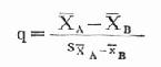 表中第(1)栏为各对比组,如第一行1与4,指A为第1组,B为第4组。第(2)栏为两对比组均数之差,如第一行为X1与X4之差,余类推。第(3)栏为四个样本均数按大小排列时,A、B两对比组范围内所包含的组数a,如第一“1与4”范围内包含4个组,故a=4。第(4)栏是按式(19.13)计算的统计量q值,式中的分母0.7919是按式(19.14)计算出来的SXA-XB。第(5)、(6)栏是根据误差自由度v与组数a查附表19-3q界值表所得的q界值,本例v误差=28,因q界值表中自由度一栏无28,可用近似值30或用内插法得出q界值,本例用近似值30查表,当a=4时,q0.05(30,4)=3.85,q0.01(30,4)=4.80,余类推。第(7)栏是按表19-13判定的。 4.结论由表19-14可见,除秋季与冬季为P<0.05外,其它任两对比组皆为P<0.01,按α=0.05检验水准均拒绝H0,接受H1,可认为不同季节的湖水氯化物含量皆不同,春季氯化物含量最高,冬季含量最低。