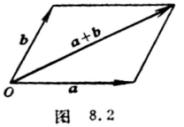 把矢量的始点移到原点O,以ab为边作平行四边行,由原点作出的对角线就表示和矢量ab(称为平行四边形法则,见图8.2);或者把二矢量首尾相接,由始点到终点的矢量即为和矢量a+b(称为三角形法则,见图8.3).