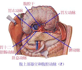 腹腔干起自主动脉裂孔稍下方的腹主动脉前壁。 Since celiac slightly below the aortic hiatus of the anterior wall of the abdominal aorta. 分支营养肝、胰、脾、胃、十二指肠、大网膜等。 Branch nutrition liver, pancreas, spleen, stomach, duodenum, omentum and so on. 腹腔干的主要分支见表9 - 3: The main branch of the celiac Table 9--3: