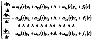 where a ik ( t ) and f i ( t )    ( ) are both known continuous functions of the independent variable t . If at least one f i ( t ) is not equal to zero, then (1) is called an inhomogeneous linear differential System of equations . If all f i ( t ) are equal to zero, then (1) is called a system of homogeneous linear differential equations, and its general form is