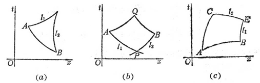 2° 第二边值问题(古沙问题) 设l1是过P点的第一族特征线,l2是第二族特征线,在l1的一段PA上给定v(x,t)的数值,在l2的一段PB上给定u(x,t)的数值,过A点作第二族特征线,过B点作第一族特征线相交于Q.求在闭区域PAQB上方程组的解(图14.2(b)).