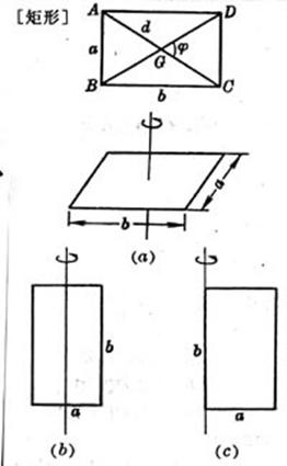 area The center of gravity G is at the intersection of the diagonals , i.e. Moment of inertia ( a ) The axis of rotation passes through the center of the rectangle and is perpendicular to the plane where the rectangle is located ( Figure ( a )) ( b ) The axis of rotation passes through the center of the rectangle and is parallel to the b side of the rectangle ( Figure ( b )) ( c ) The axis of rotation coincides with the b side of the rectangle ( Figure ( c )) area The center of gravity G is at the intersection of the diagonals , i.e. Moment of inertia ( a ) The axis of rotation coincides with the diagonal ( Fig. ( a )) ( b ) The rotation axis passes through the center of gravity G and is perpendicular to the plane where the figure is located ( Figure ( b )) |